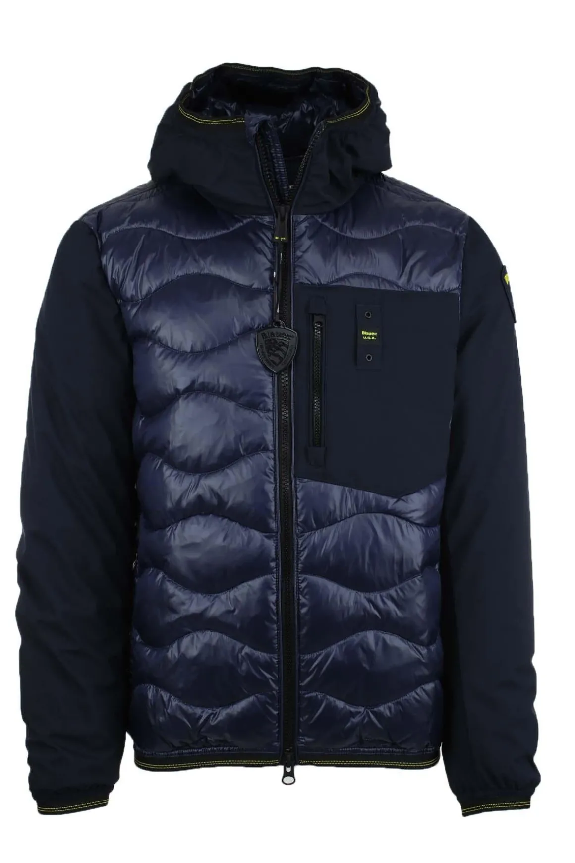 Piumino uomo Albert, l’esclusivo modello realizzati in due tessuti monocromatici, neoprene nelle maniche e nylon impunturato a onde nel corpo, un mix che rende il modello Albert tra i capi più richiesti della collezione Blauer, imbottitura mista piuma/poliestere, chiusura centrale con zip, tasche ai fianchi con zip, cappuccio fisso, taschino con zip sul petto, fondo vita e polsini profilati con elastico rigato, patch e passante Blauer, vestibilità regolare.