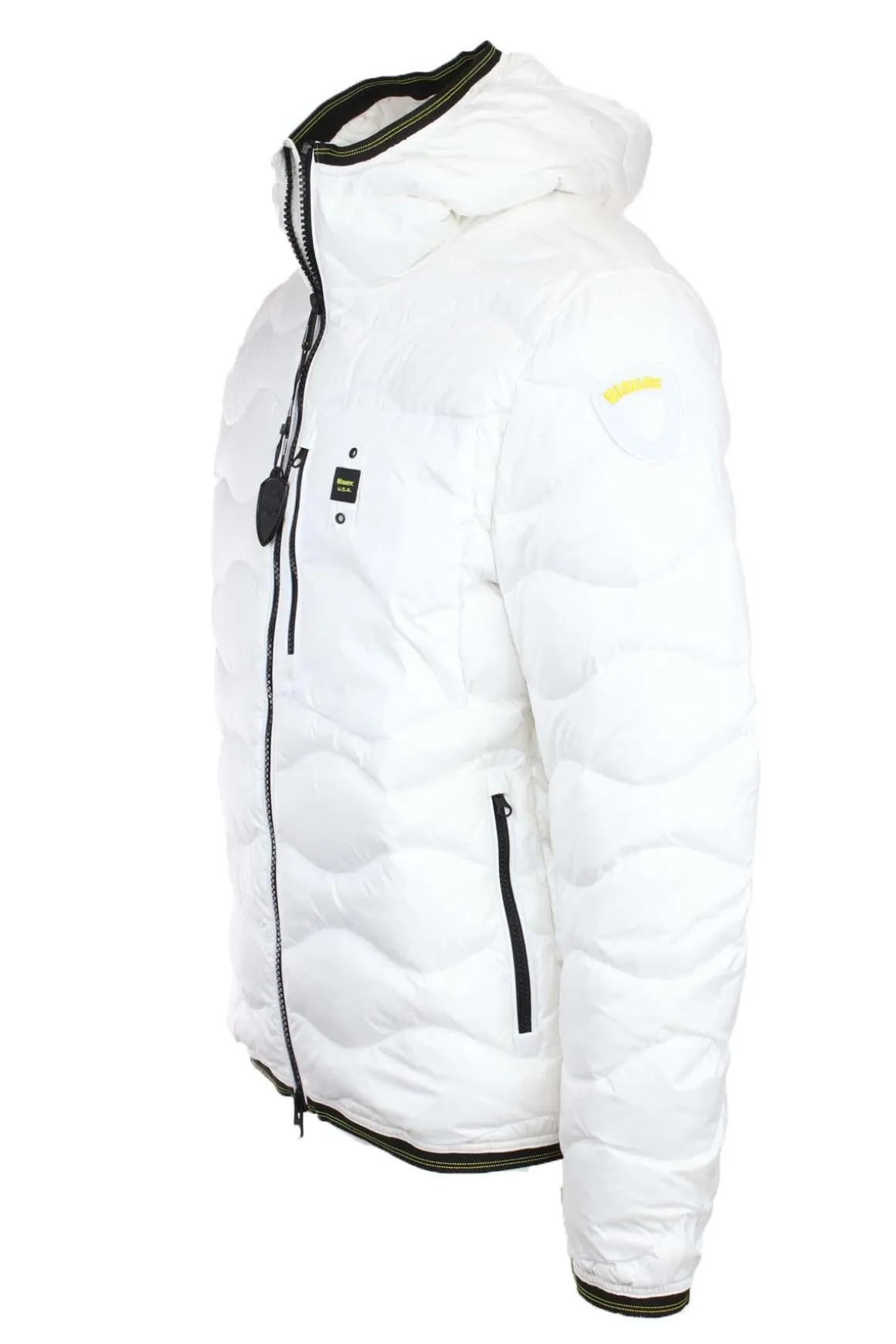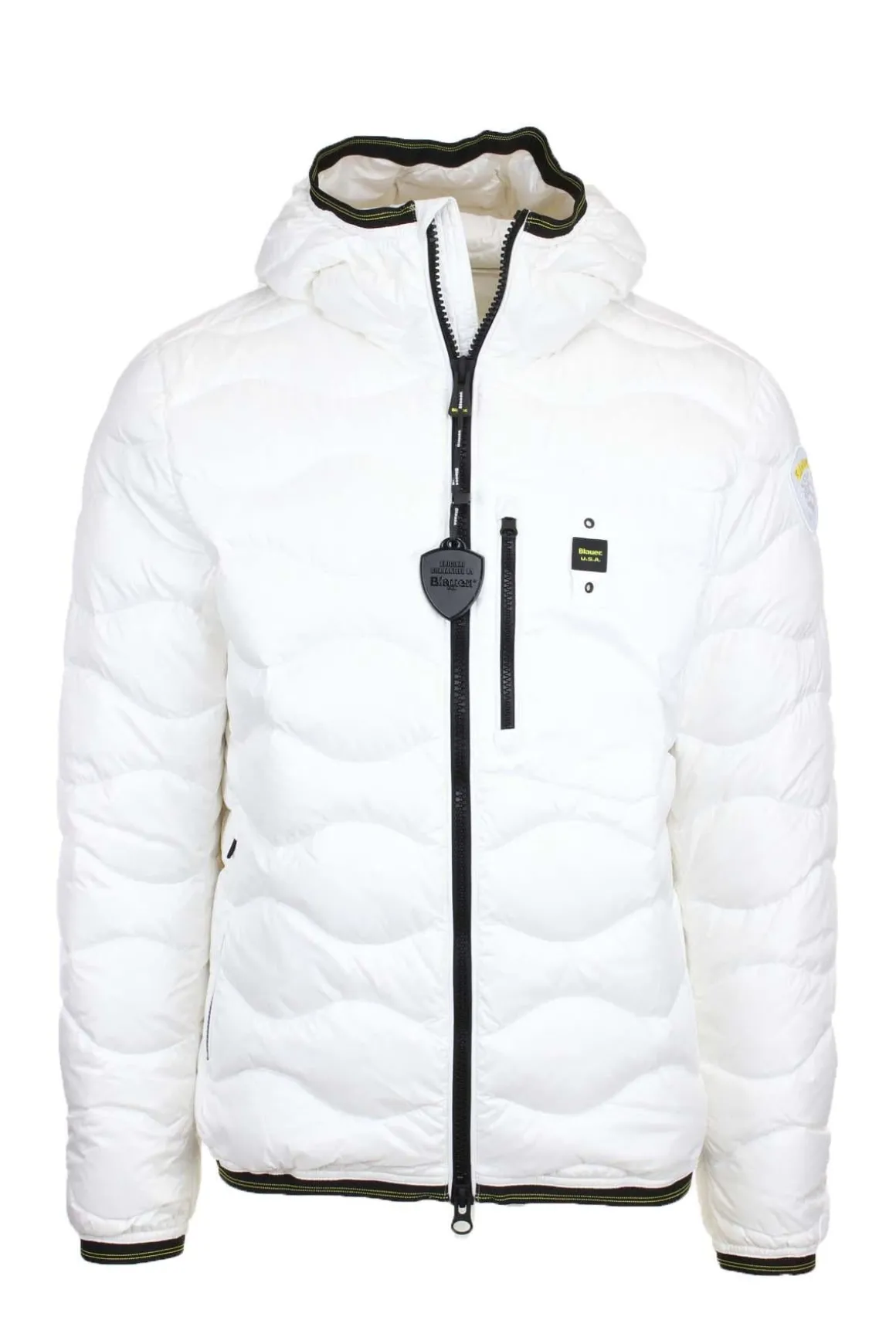 Piumino uomo Blauer, realizzato in nylon, imbottitura in piuma leggera 165 gr. caldo e poco ingombrante, impunturato a onde, cappuccio fisso, taschino con zip sul petto, chiusura con zip, tasche ai fianchi con zip, polsini e fondo vita con fettuccia elastica per una migliore vestibilità, passante e patch Blauer, interno foderato in tinta con tasche, capo iconico della collezione Blauer, vestibilità regolare.