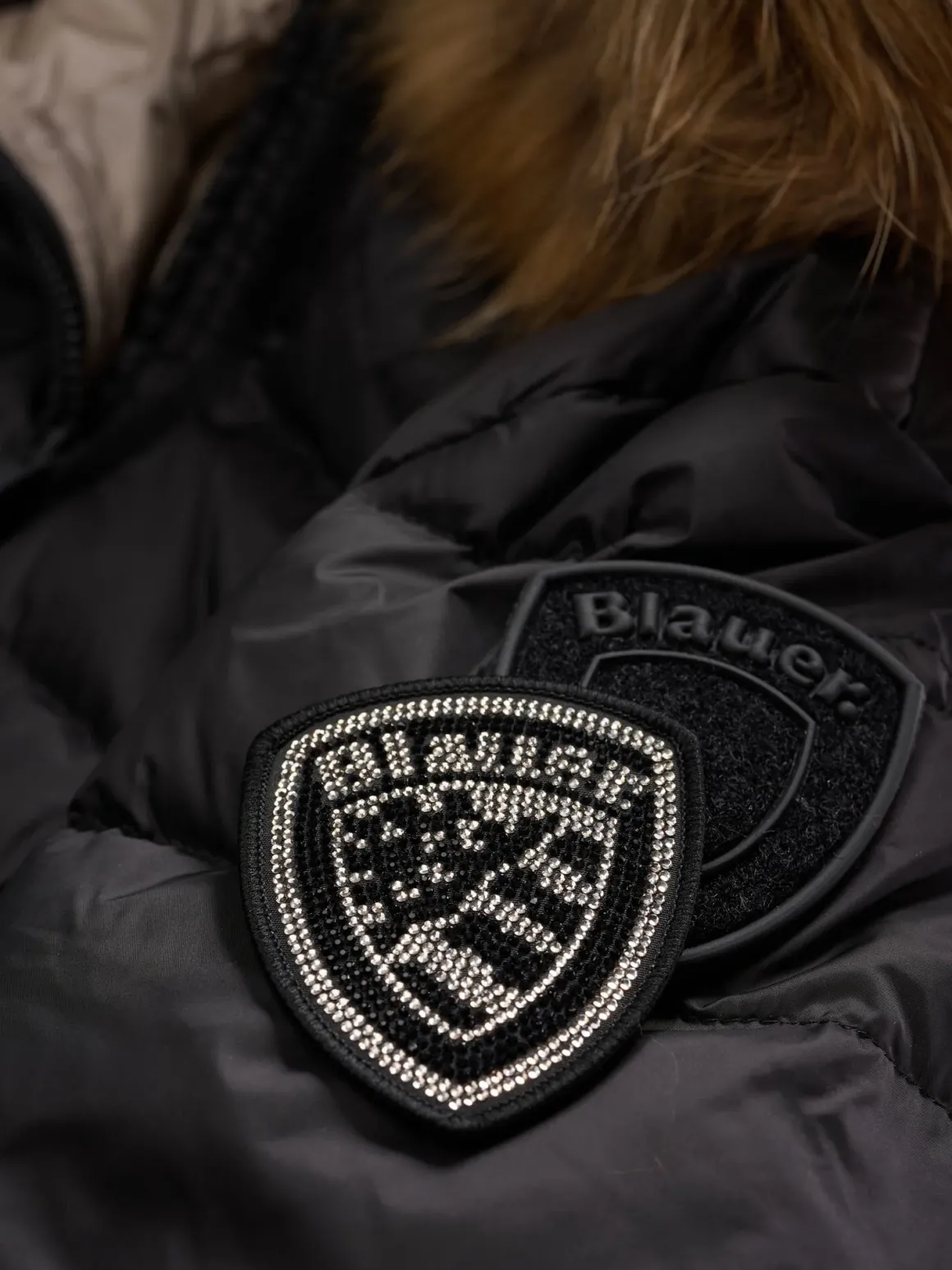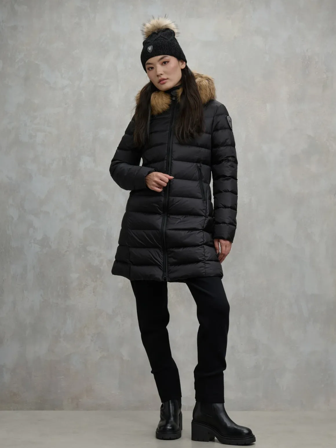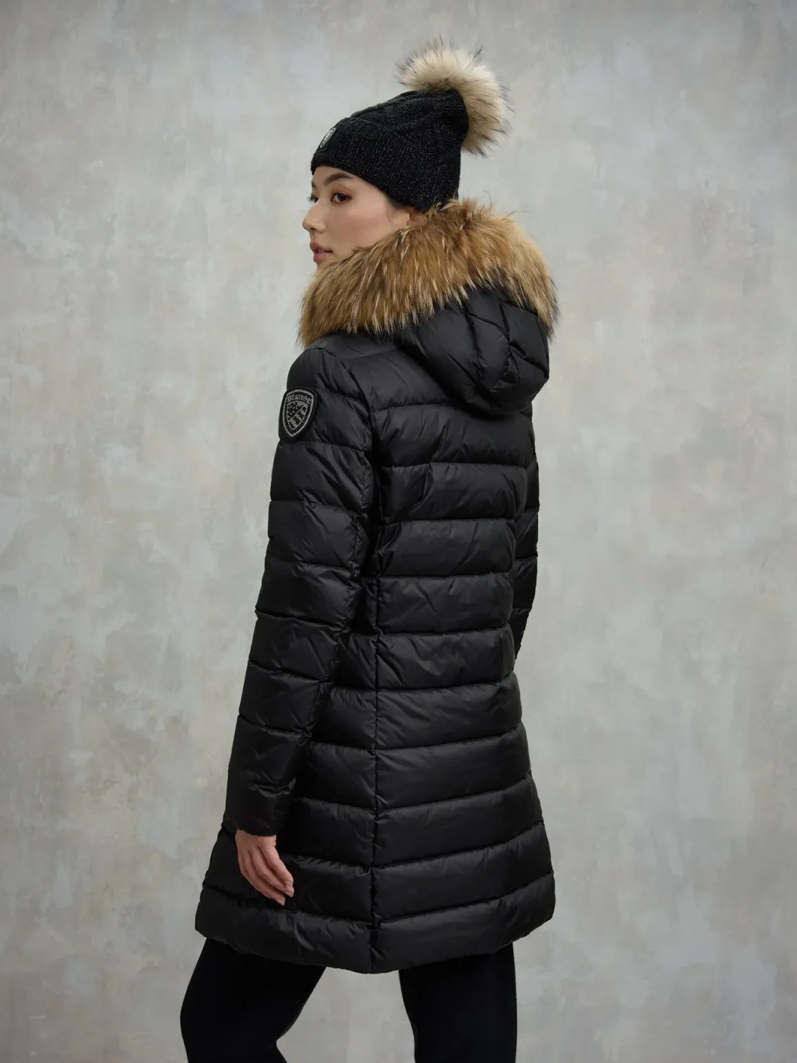 Piumino lungo donna Blauer con cappuccio bordato in vera pelliccia removibile, trapuntato orizzontale con imbottitura in piuma 215gr, caldo e poco ingombrante, realizzato in nylon con interno in contrasto con tasche, chiusura con zip nascosta e tasche ai fianchi con zip, dettagli con patch glitterato luccicante e passante logato, taglio che esalta il punto vita, la modella è alta 1,79 cm e indossa la taglia S.