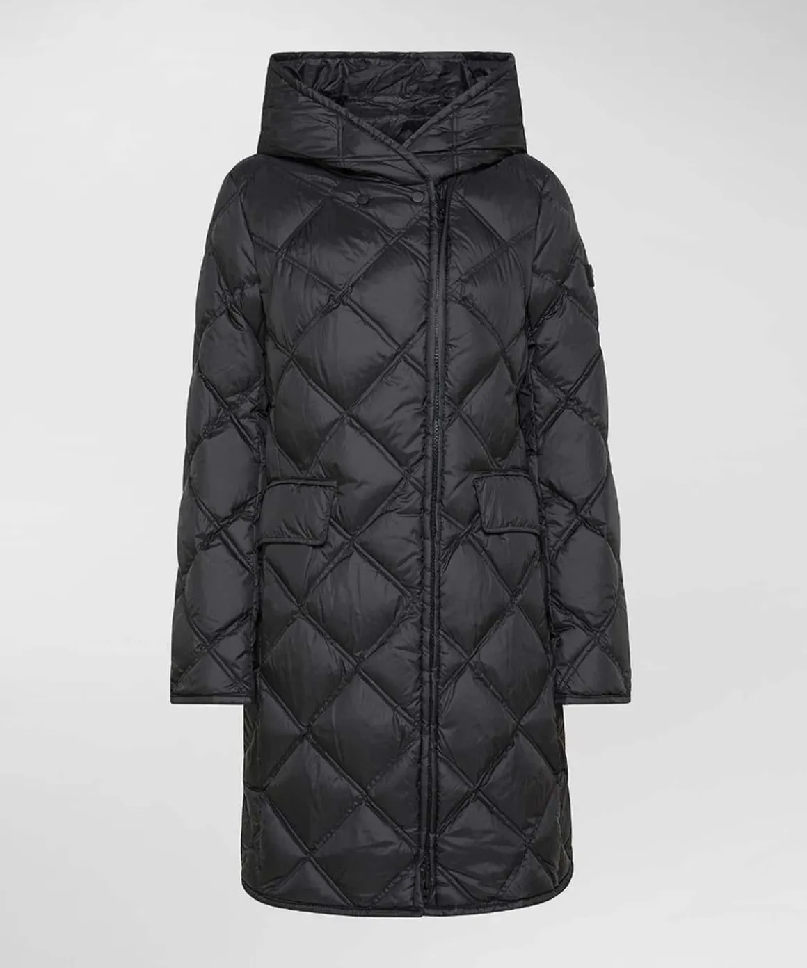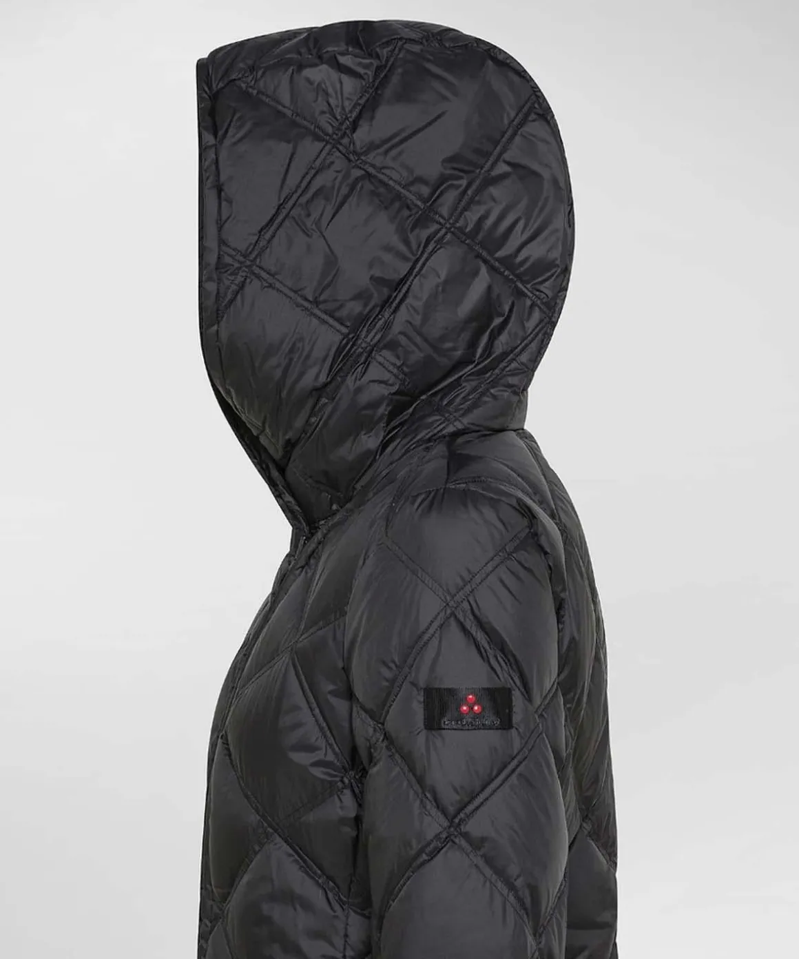 Piumino lungo Peuterey con trapunte a rombi, collo alto con cappuccio, tasche ai fianchi con pattina, realizzato in leggero e morbido tessuto tecnico riciclato, imbottitura in piuma naturale, poco ingombrante ma molto calda, logo peuterey sul braccio, tessuto 100% poliestere, idrorepellente, vestibilità regolare.