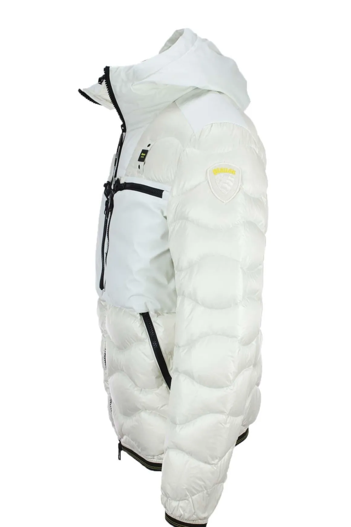 Piumino uomo Blauer con cappuccio fisso, caratterizzato da due ampi tasconi con zip e interno tasca portacellulare, impunture a onde, passante e patch Blauer, tasche anteriori con zip, interno in tinta, fondo vita e polsini in fettuccia elasticizzata, imbottitura 90% pima d’anatra, 10% piuma, tessuto 100% poliestere, vestibilità regolare.