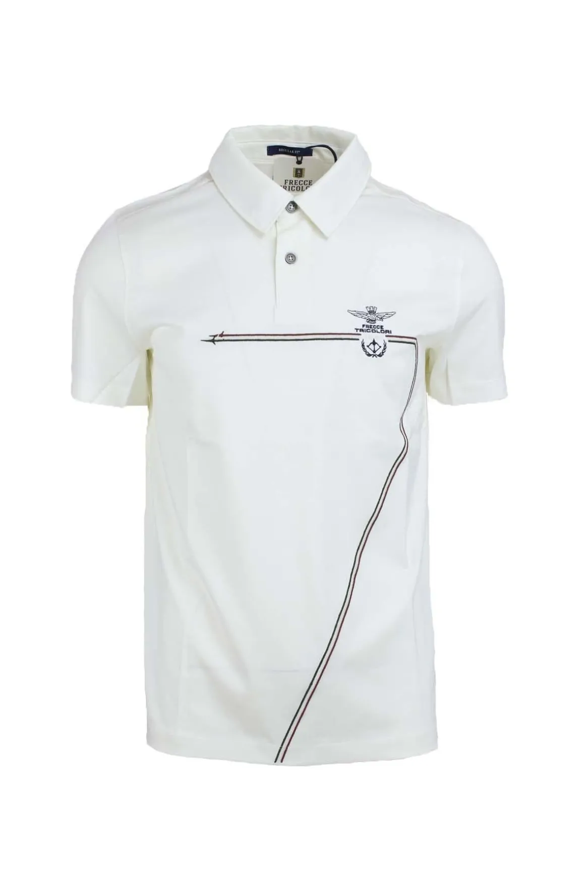 Polo mezza manica uomo Frecce Tricolori Aeronautica Militare, realizzata in cotone jersey mercerizzato con un aspetto luminoso e morbido al tatto, colletto tre bottoni, logo Frecce Tricolori, più lunga dietro, vestibilità regolare, 100% cotone.