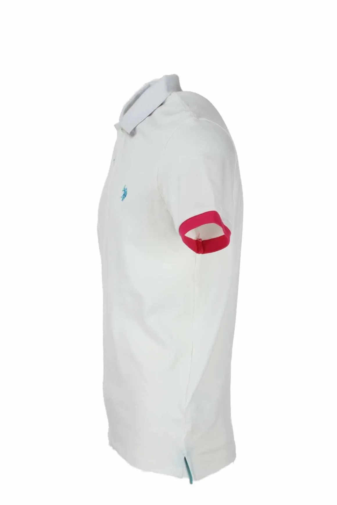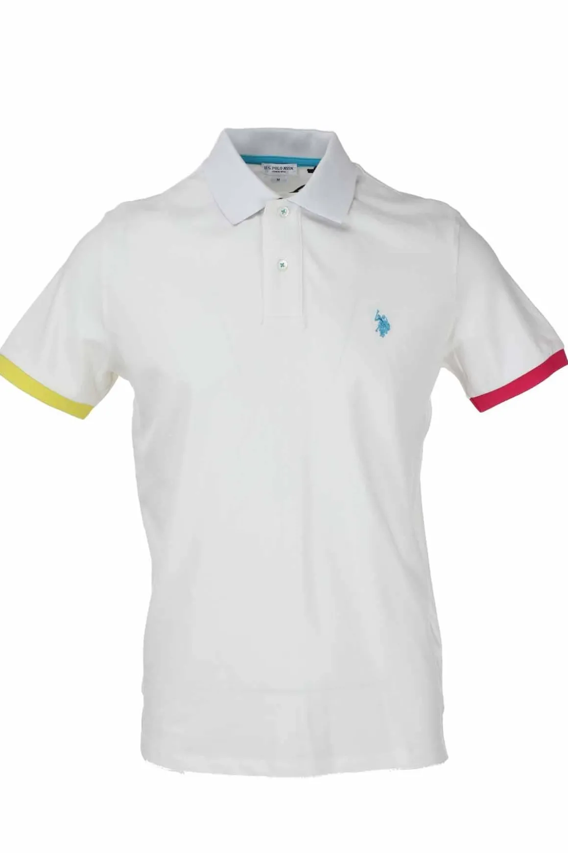 Colletto a due bottoni, bordo maniche con profili multicolor, logo US POLO ASSN ricamato sul petto, spacchetti sul fondo con dietro più lungo, sottocollo in contrasto con scrita Us Polo Assn, 100% cotone piquet.
