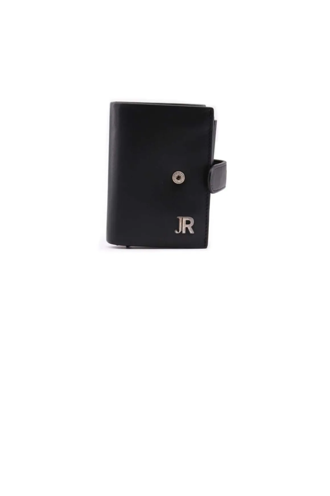 Pratico e sicuro il porta carte di credito con sistema anticlonazione, chiusura con passante e bottone a pressione, due scomparti laterali, scomparto centrale, logo JR in metallo, vera pelle, misure chiuso cm.10,5×7,0x2,5