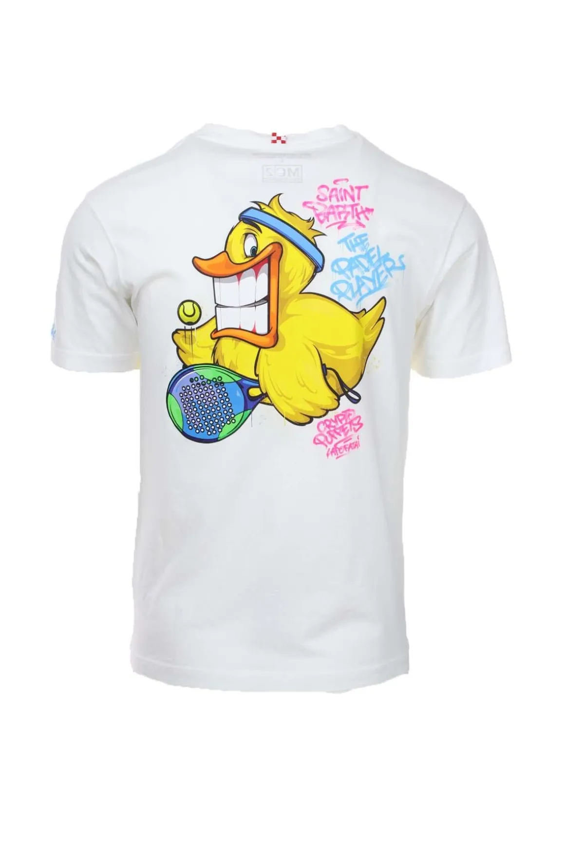 T-shirt mezza manica uomo stampa sul petto e sul retro The Padel Players by crypto Puppets Ready to Smile, ricamo MC2 Saint Bart nella manica, realizzata in jersey di cotone, vestibilità regolare, 100% cotone organico.